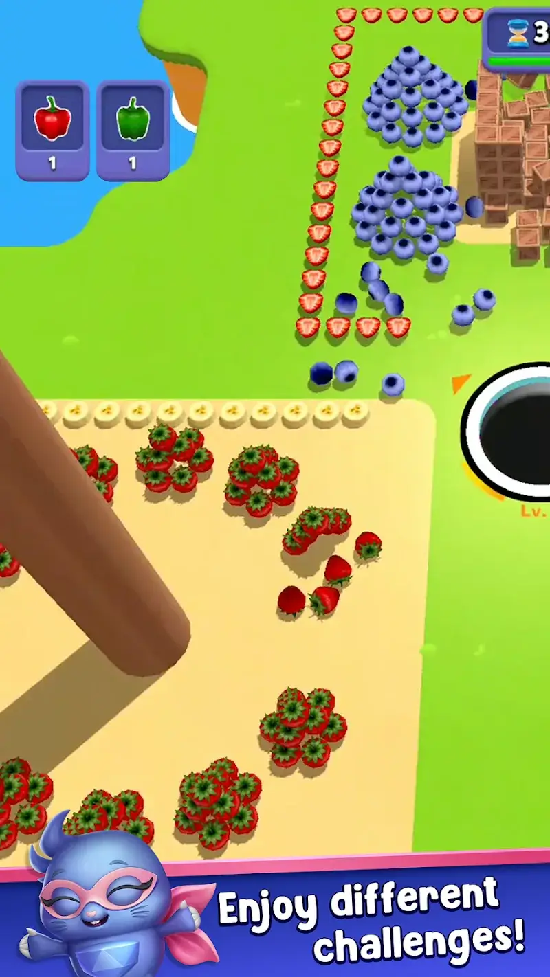 All in Hole Mod is a casual physics puzzle game where players control a growing black hole to consume arranged objects, primarily food items, within a time limit. The core loop involves strategic movement to maximize consumption and meet level objectives. The game targets a broad audience seeking a simple, visually satisfying time-filler with light progression elements.