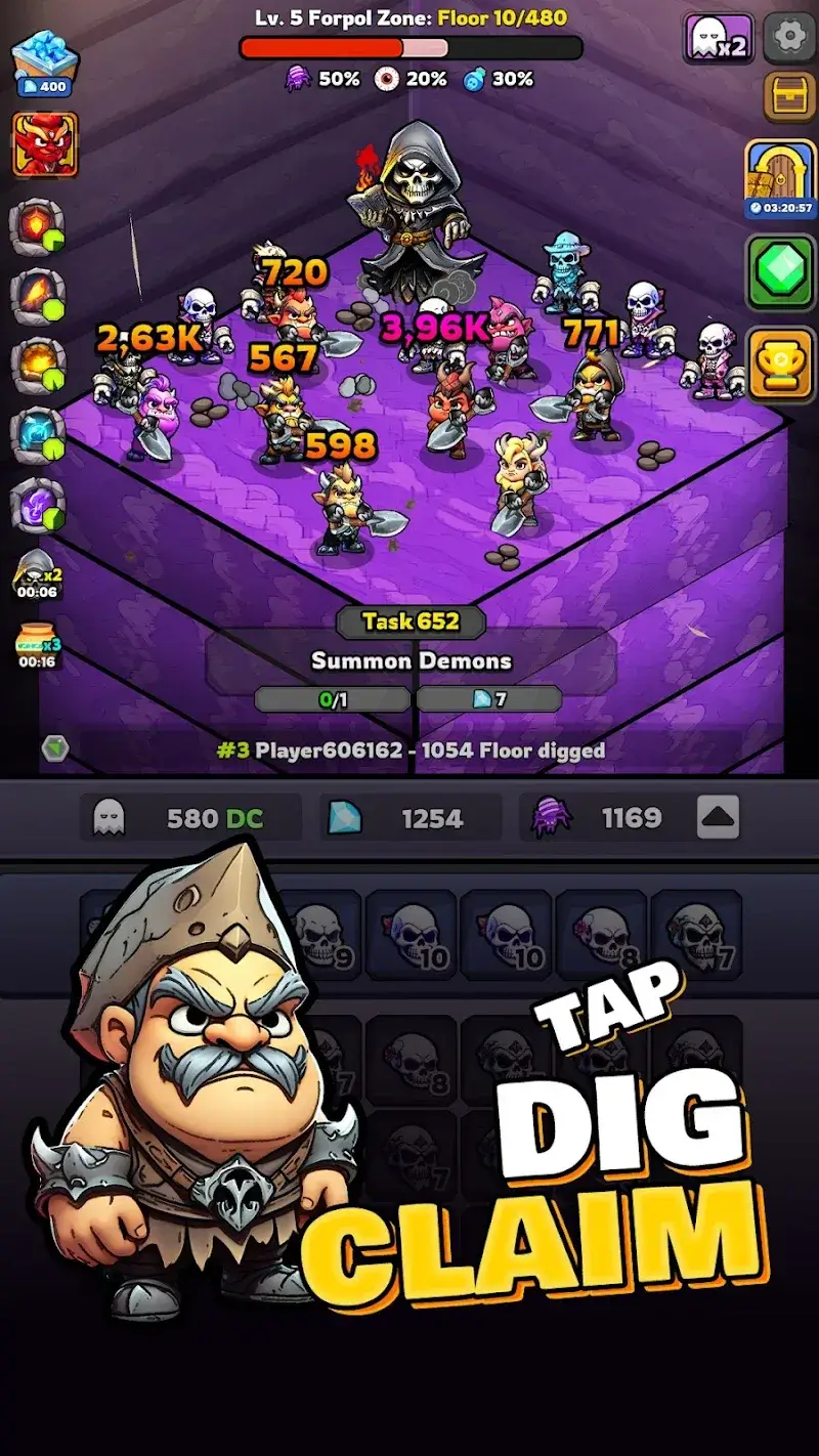 Necro Hell Miner Mod is an idle simulation RPG where players merge skeleton units to create an automated workforce that mines resources continuously, even while offline. The core loop involves combining identical low-tier skeletons to unlock more powerful variants, which in turn gather resources faster and unlock deeper areas. This mod APK targets players who want to bypass the game's progression gates and grind to focus on the strategic merging and expansion mechanics.