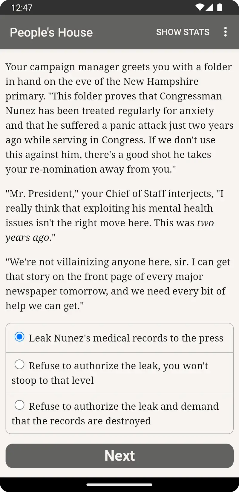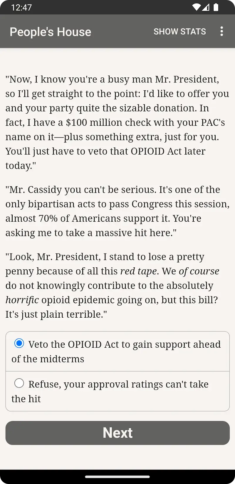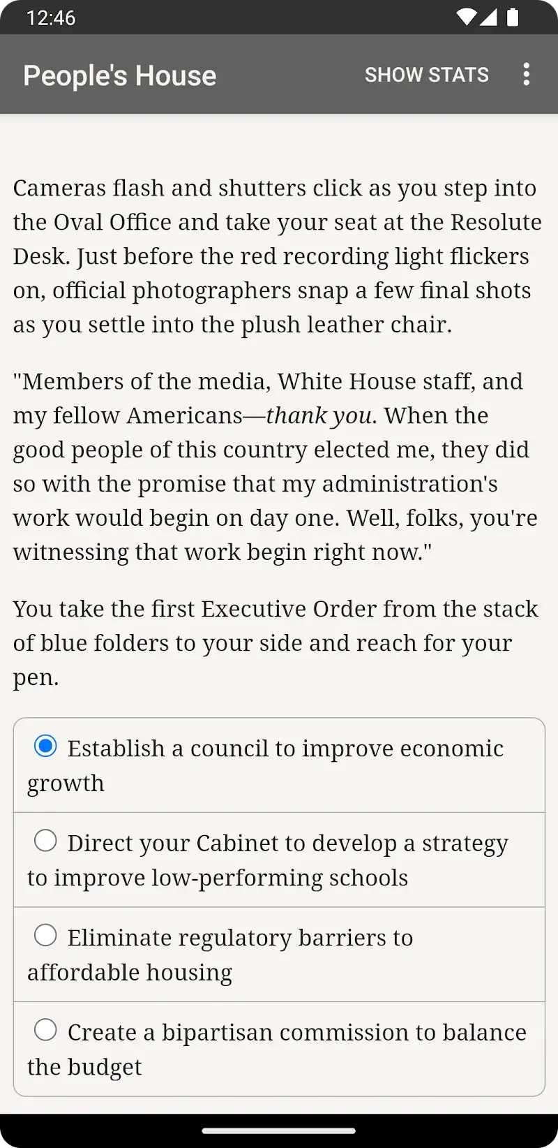 The People's House Mod is a text-based interactive fiction game where the player assumes the role of the President of the United States. It is a choice-driven narrative RPG focused on political decision-making and managing national affairs, presented entirely through prose without images or sound. The game is targeted at players who enjoy deep, branching storylines and high-stakes simulation within a political context.